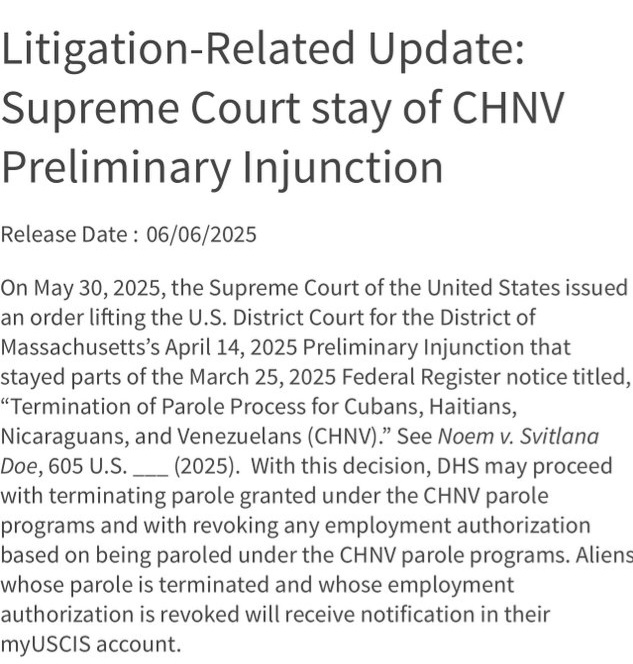 La Cour suprême des États-Unis a rendu une ordonnance levant l’injonction préliminaire du tribunal de district du Massachusetts du 14 avril 2025, qui suspendait partiellement l’avis du Federal Register du 25 mars 2025 intitulé « Fin du processus de libération conditionnelle pour les Cubains, les Haïtiens, les Nicaraguayens et les Vénézuéliens (CHNV) ». Voir Noem c. Svitlana Doe , 605 US ___ (2025).