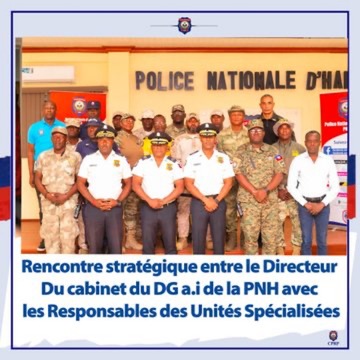 Une rencontre stratégique de haut niveau s’est tenue ce dimanche 10 Août 2025 à la Police Nationale d’Haïti (PNH), orchestrée par IG Berson SOLJOUR, Directeur de Cabinet du Directeur Général par intérim. Sous les instructions précises du Commandant en Chef a.i, M. André Jonas Vladimir PARAISON, cette réunion a rassemblé les responsables des unités spécialisées. L’objectif : repenser les stratégies opérationnelles pour renforcer la sécurité nationale face aux défis croissants.
